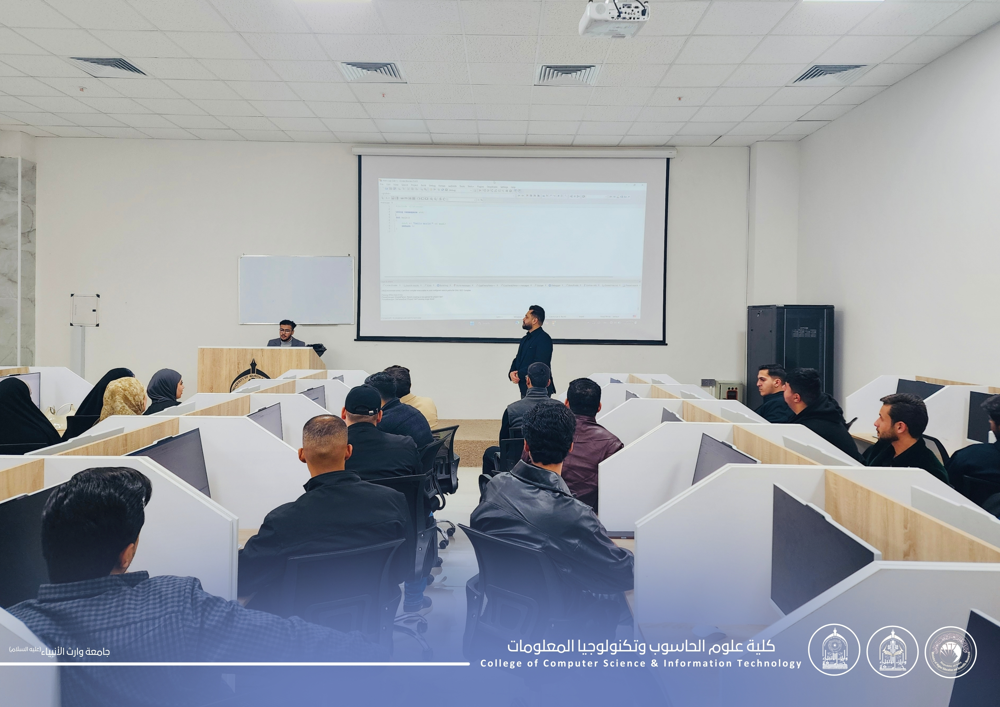 ضمن المحاضرات العملية لطلبة المرحلة الأولى في كلية علوم الحاسوب وتكنولوجيا المعلومات – جامعة وارث الأنبياء (عليه السلام)، يواصل الطلبة تطبيق مفاهيم🔹Fundamentals of Programming🔹Digital Logicداخل مختبر الحاسبات.