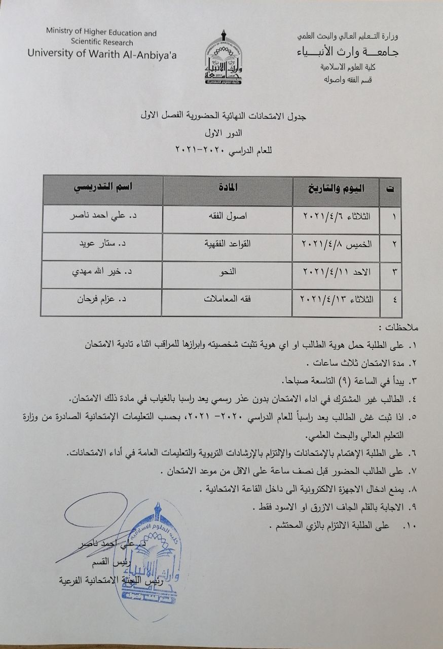 2021/03/30جدول الامتحانات النهائية الحضورية لقسم الفقه واصوله للفصل الاول