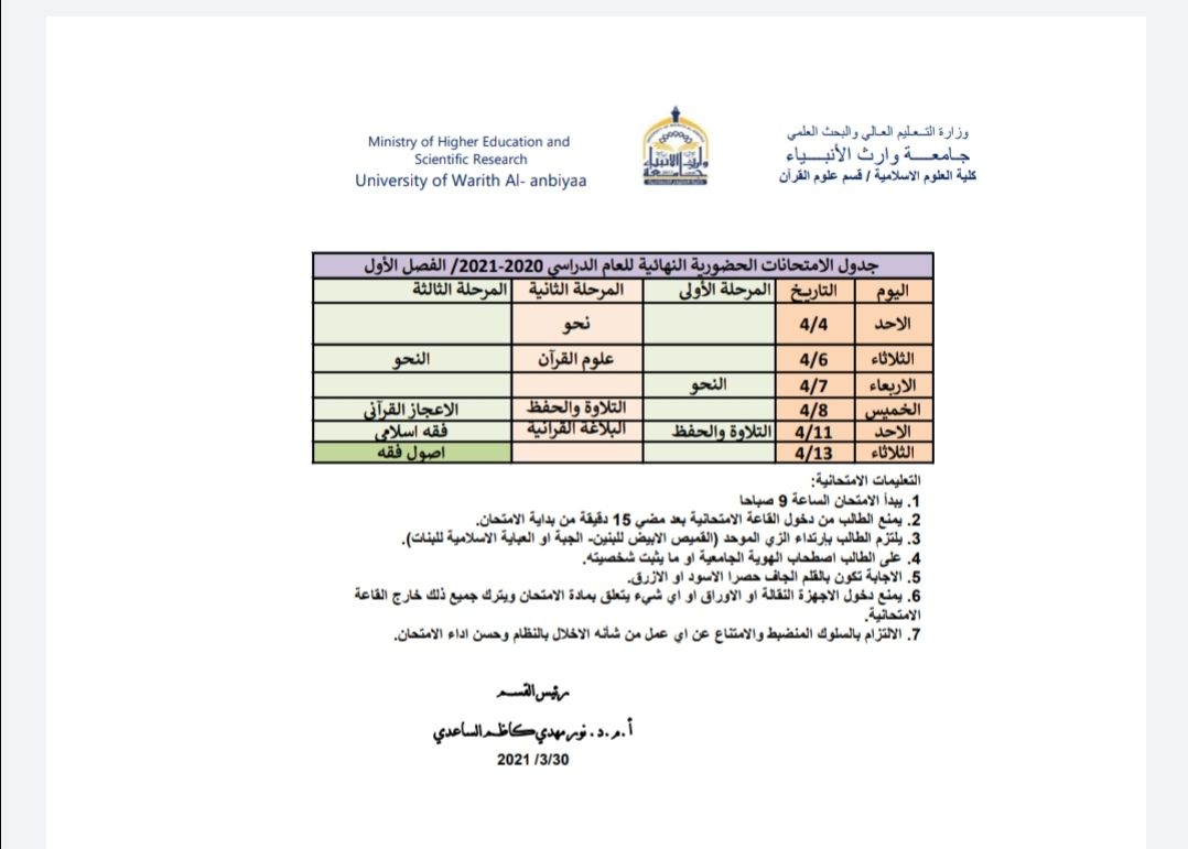 2021/03/30جدول الامتحانات النهائية الحضورية لقسم علوم القرآن للفصل الاول