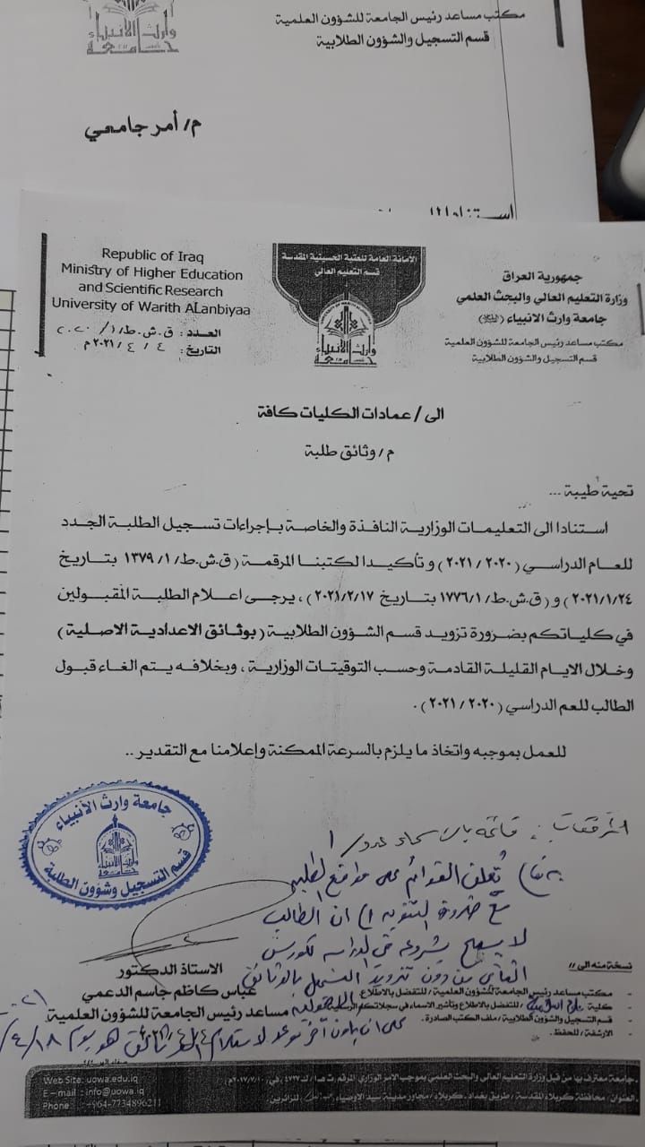 2021/04/11على الطلبة المدرجة أسماءهم ادناه جلب وثائقهم وتسليمها إلى قسم التسجيل علما أن آخر موعد لاستلامها هو بتاريخ ١٨ / ٤ / ٢٠٢١