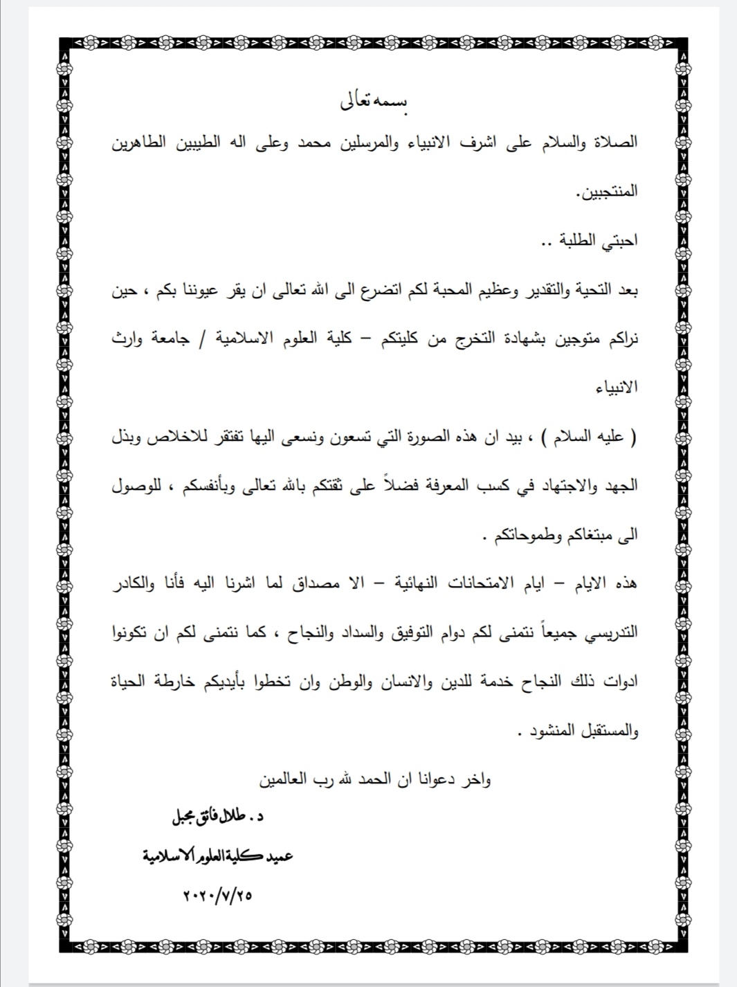 بمناسبة انتهاء الفصل الدراسي الثاني للعام2019-2020 ونجاح عملية التعليم الإلكتروني يتقدم عميد كلية العلوم الإسلامية ( الدكتور طلال فائق الكمالي) والكادر التدريسي الى الطلبة الأعزاء بأجمل التهاني والتبريكات مع فائق الشكر والتقدير على ما بذلوه من مجهود شاق واخلاص وتفان كبير في أداء واجباتهم خلال السنة الدراسية آملين أن يكون اداء امتحانات الفصل الدراسي الأول لعامنا الدراسي الحالي 2019 _ 2020 بنفس الهمة والاستعداد