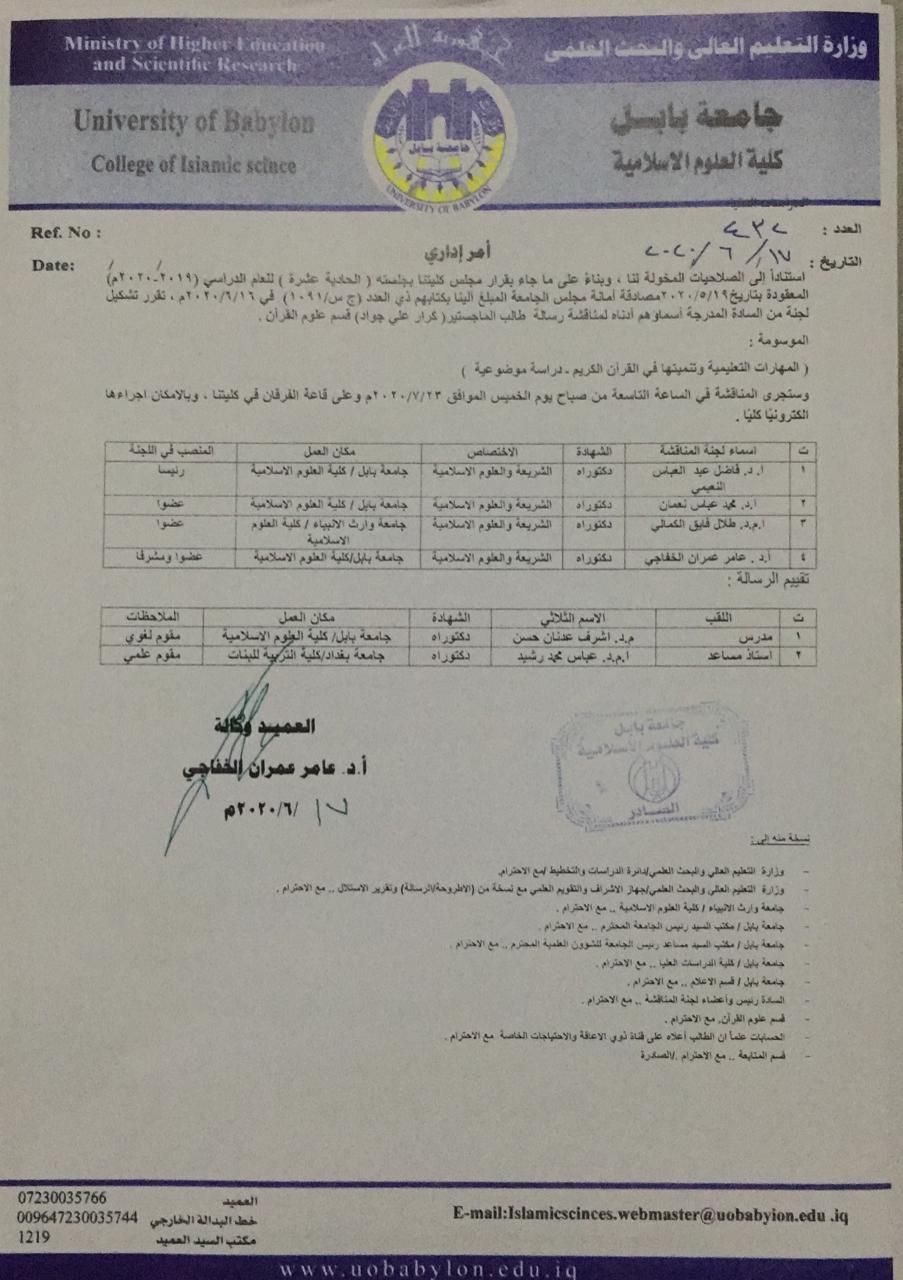 2020/08/24استضافت جامعة بابل / كلية العلوم الإسلامية (الدكتور طلال فائق الكمالي) عضواً في لجنة مناقشة رسالة الماجستير الموسومة (المهارات التعليمية وتنميتها في القرآن الكريم _ دراسة موضوعية) استنادا إلى الأمر الإداري المرقم ٤٣٢ بتاريخ 17/6/2020 وذلك في صباح يوم الخميس الموافق23/7/2020 على قاعة الفرقان