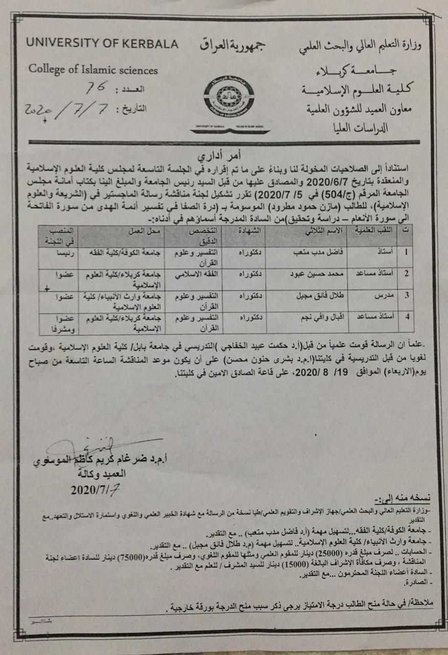 2020/10/01شارك الدكتور ( طلال فائق الكمالي) في لجنة مناقشة رسالة الماجستير الموسومة ب ( درة الصفا في تفسير أئمة الهدى من سورة الفاتحة إلى سورة الأنعام _ دراسة وتحقيق) في جامعة كربلاء / كلية العلوم الإسلامية في يوم الأربعاء الموافق 19 /8 /2020 على قاعة الصادق الأمين.