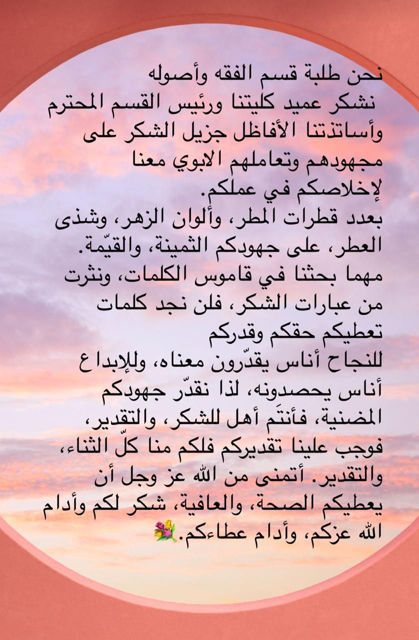 2020/10/01شكر وعرفان تقدم بها طلبة قس الفقه واصوله إلى عمادة وأساتذة كلية العلوم الإسلامية على ما بذلوه من جهد وتفاني طيلة السنة الدراسية