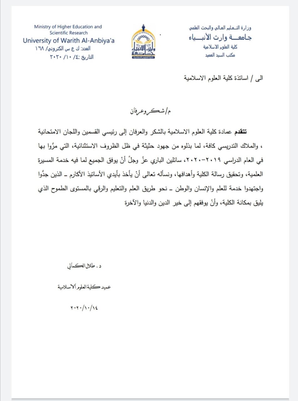 2020/11/17قدم عميد كلية العلوم الإسلامية المحترم ( الدكتور طلال فائق الكمالي) شكر وعرفان للكادر التدريسي تقديرا لجهودهم في العام الدراسي 2019_2020