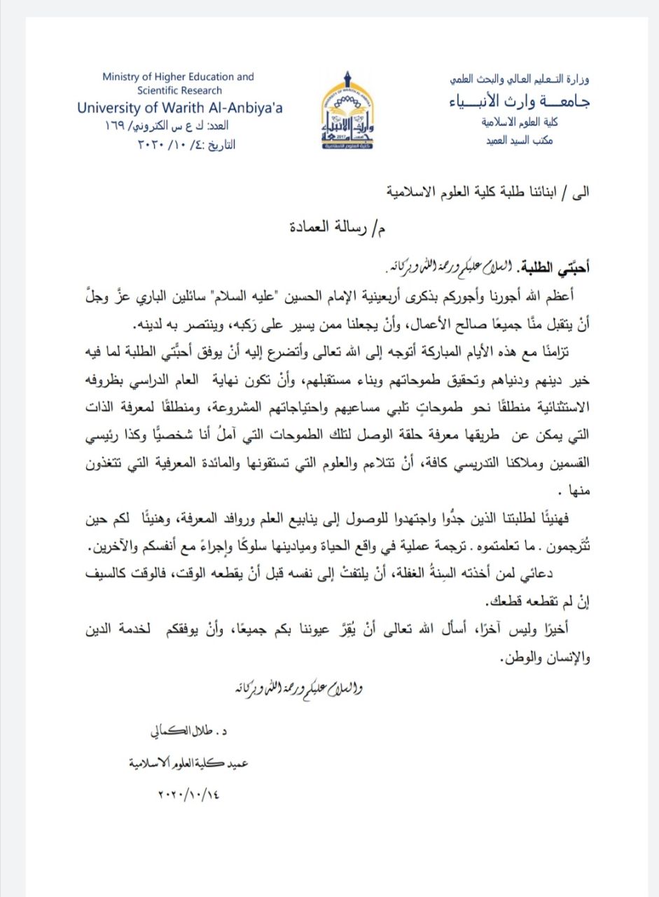 2020/10/04كلمات من الشكر والثناء والدعاء قدمها عميد كلية العلوم الإسلامية المحترم (الدكتور طلال فائق الكمالي) لأبنائنا واعزائنا الطلبة في نهاية العام الدراسي
