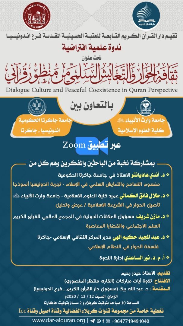 2020/12/15شاركت كلية العلوم الإسلامية / جامعة وارث الأنبياء في الندوة العلمية الافتراضية الموسومة ب ( ثقافة الحوار والتعايش السلمي من منظور قرآني) التي أقامها دار القرآن في العتبة الحسينية المقدسة فرع اندنوسيا بالتعاون مع جامعة جاكرتا الحكومية