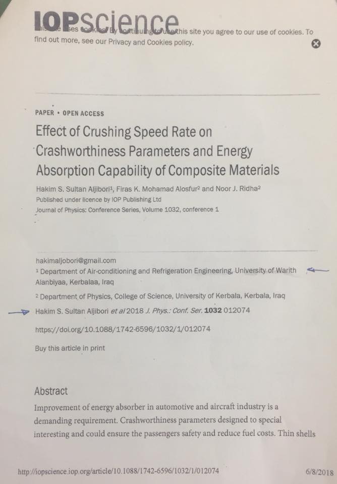 نشر الباحث والتدريسي في كلية الهندسة الاستاذ المساعد الدكتور حاكم سماوي سلطان بحثاً علمياً جديداً بعنوان (تأثيرنسب سرعة الصدمات على قابلية امتصاص الطاقة للمواد المركبة في الطائرات) في المجلة العالميّة(Journal of physics) ذات معامل التأثير الرصين ،وقال الدكتور ان البحث هو عبارة عن تصميم جهاز لأمتصاص طاقة الصدمات في الطائرات وبسرع مختلفة والجهاز مصمم بشكل وبمواد مركبة مخلوطة بنِسَب معينة يعطي قابلية اكثر لامتصاص الطاقة مما يقلل نسبة الضرر وعدم وصول هذا الطاقة للركاب، وبقدر معين يمكن للجهاز ان يركب على الطائرات او السّيّارات ، ويذكر ان الباحث له العديد من البحوث المهمة المنشورة في مجلات عالمية ومنها ماهو مختص بالطائرات.
