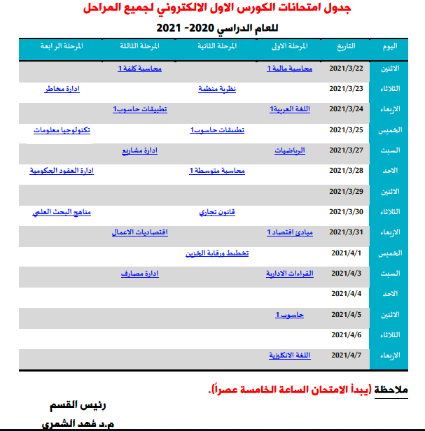 جداول الامتحانات الالكترونية للمرحلة الاولى
