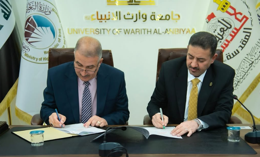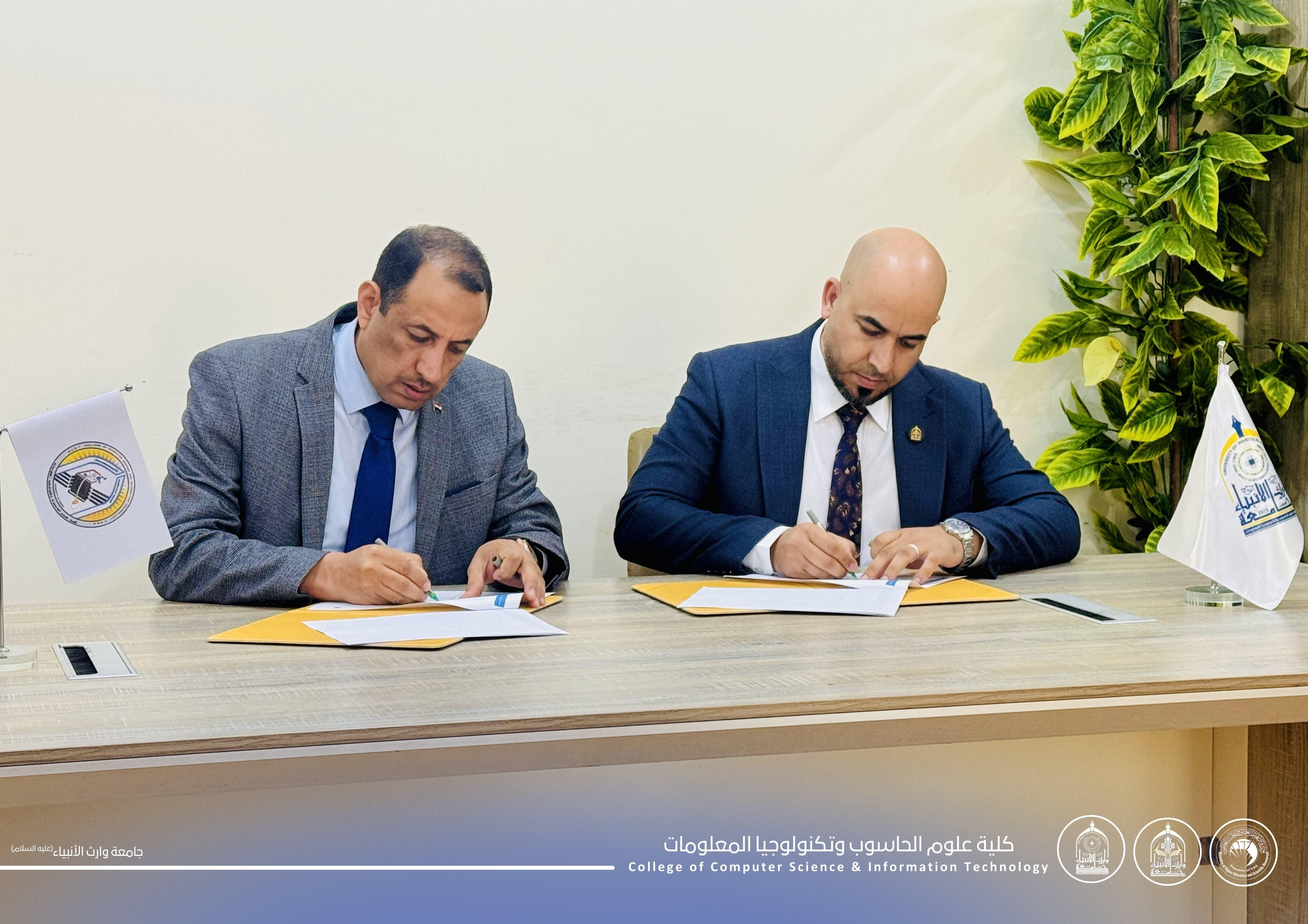 As part of strengthening academic cooperation and the exchange of scientific expertise, Assistant Professor Dr. Haider Mohammed Ali Al-Ghanmi, Dean of the College of Computer Science and Information Technology at the University of Warith Al-Anbiyaa (peace be upon him), signed a scientific twinning agreement with Professor Dr. Salah Awad Salman Al-Issawi, Dean of the College of Computer Science and Information Technology at the University of Anbar. The agreement includes the Department of Artificial Intelligence in our college and the Department of Artificial Intelligence at the University of Anbar.